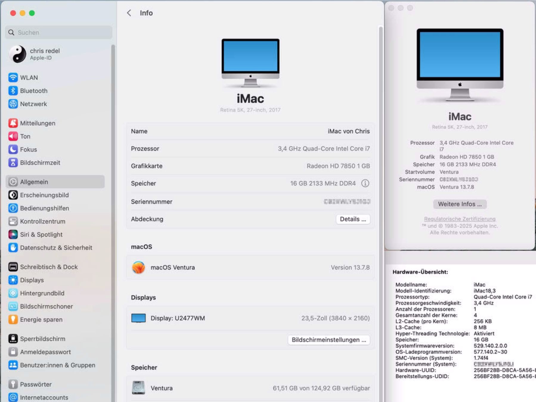Ich spiele gerne mit kleineren Herausforderungen herum. In diesem Fall sollte ein PC mit einem ASR-H170A-X1 Mainboard, i7-6700 (65W), 16GB DDR4 RAM, AMD Radeon HD 7850 (1GB), BT USB Stick von ASUS und ASUS WLAN Karte mit Ventura installiert werden. Damit Ventura überhaupt mit der alten HD 7850 zurecht kommt, muss der Opencore Lagacy Patcher installiert werden. Das Mainboard könnte zwar auch die Intel HD 530 CPU Grafik zu Verfügung stellen, was mit Windows überhaupt kein Problem ist, unter MacOS habe ich es aber nicht geschafft, den einzig auf dem Board zur Verfügung stehenden DVI Port zu einer Bildschirmausgabe zu bewegen, weswegen ich zur alten Radeon griff. Bis Monterey war es kein Problem die Grafikhardware zu verwenden. Nach einigem Aufwand lief dann aber alles einwandfrei, wie ich es mir gewünscht habe und am Ende sieht dann die Systemübersicht so aus.