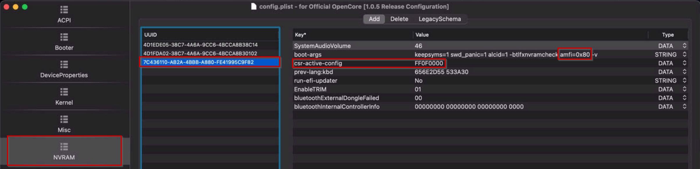 Folgende nötige Einträge in der OC config habe ich übernommen, damit sich der Post-Install Root Patch später unter Ventura nachinstallieren lässt.