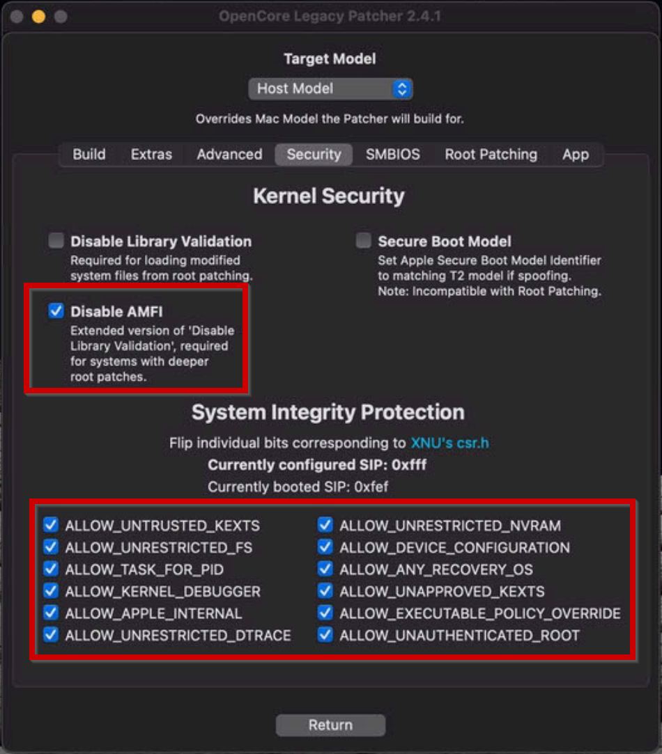 In meinem speziellen Fall wusste ich, dass meine Hardware schon alt ist und ich mich mit einem iMAC18,3 zufireden geben will. Der native Support für meine Radeon HD 7850 endete mit Monterey. Ich wusste aber schon vorher, dass sich die Radeon mit MacOS 13 und dem OCLP betreiben lässt. Hier gibt es aber auch Hürden, die zu nehmen sind. SIP und AMFI müssen deaktiviert sein, ansonsten lässt sich später Ventura nicht mit dem Post-Install Root Patch verarzten.